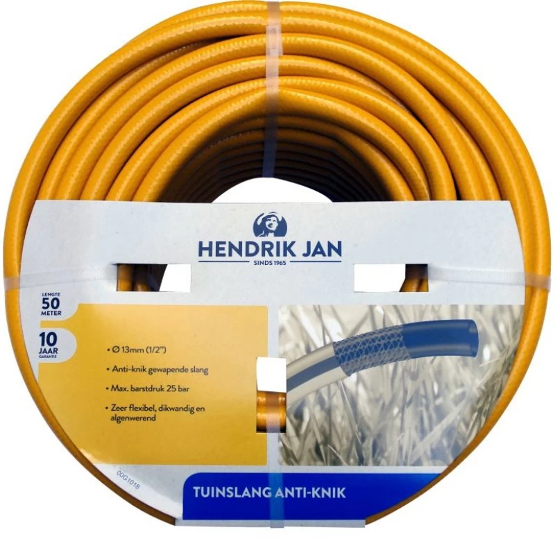 Deze Hendrik Jan anti-knik gewapende tuinslang heeft een lengte van 50 meter en een doorsnede van 13 mm (1/2 inch). Deze slang is zeer flexibel, dikwandig en algenwerend.